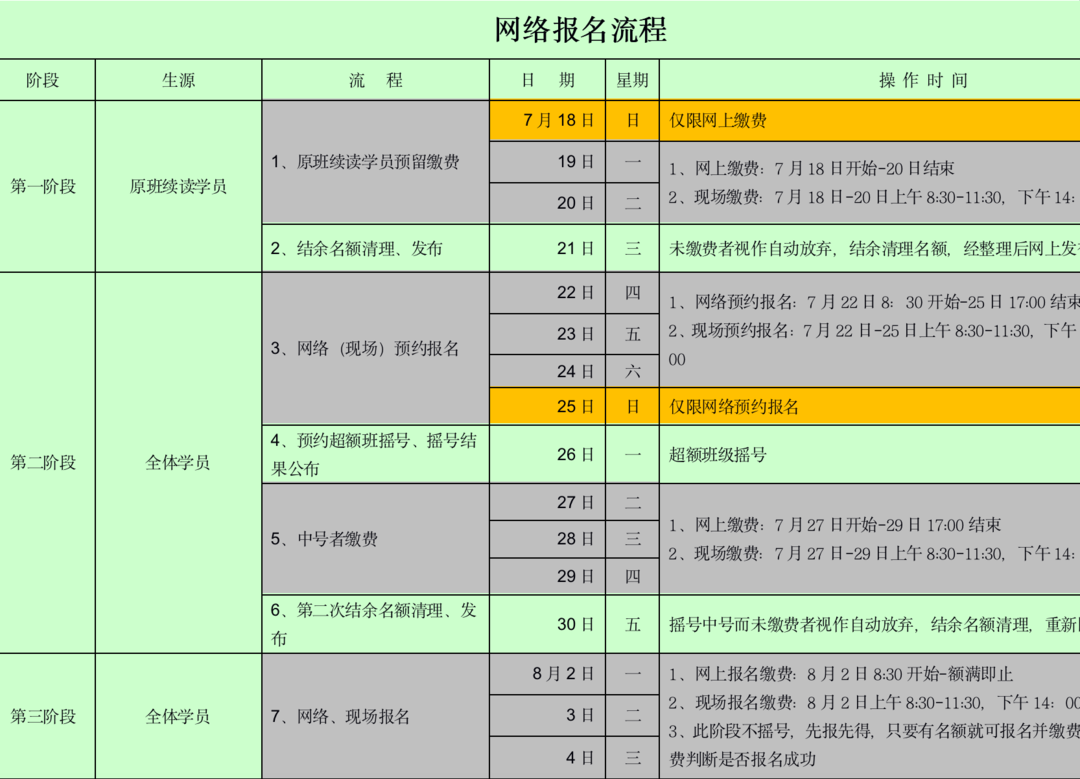 5、繳費時限:原班預(yù)留、搖號中號者,必須在規(guī)定時間內(nèi)繳費,超出時間未繳費的視作自動放棄,班級名額重新在網(wǎng)上發(fā)布。